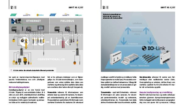 #automasjon#, #automatisering#, #instrumentering#, #sensor#, #elmotor#, #Ethernet#, #PLS#, #kontrollsystem#, #nivåmåler#, #trykkmåler#, Temperatursensor#, #mengdemåler#53 / 86 AMNYTT NR. 4 2017 Moderne kommunikasjons- teknologi gir sensorer og aktuatorer økt funksjonalitet meldinger sendt til et lystårn som indikerer hvilke fargesegmenter som skal lyse). Prosessdata over- føres syklisk i en definert dataramme. I tillegg blir statusdataindikasjoner av om prosessdata er gyl- dig, overført sammen med prosessdata. Hendelsesdata refererer til varsler som feil- meldinger eller vedlikeholds varsler (f.eks. Overoppheting av enheten, skitten linse) som overføres asyklisk fra IO-Link-enheten til mas- ter når en hendelse oppstår. Tjenestedata - også kalt Enhetsdata - refererer til informasjon om selve sensoren, for eksem- pel parameterverdier, modell- og serienumre, enhetsbeskrivelser, etc. Tjenestedata kan både skrives til enheten eller leses fra enheten asyklisk. Remote konfigurering og overvåking Med IO-Link kan man lese og endre enhetspa- rametere gjennom styresystemprogramvaren. Dette muliggjør rask konfigurasjon og igangkjø- ring noe som sparer tid og ressurser. I tillegg