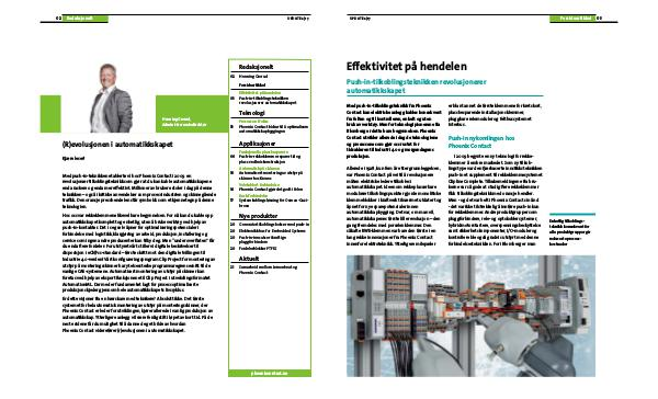#automasjon#, #automatisering#, #instrumentering#, #sensor#, #elmotor#, #Ethernet#, #PLS#, #kontrollsystem#, #nivåmåler#, #trykkmåler#, Temperatursensor#, #mengdemåler#Forsideartikkel UPDATE 2|17 Effektivitet på hendelen Push-in-tilkoblingsteknikken revolusjonerer automatikkskapet Med push-in-tilkoblingsteknikk fra Phoenix Contact kan elektriske anlegg kables konsekvent fra felten og til kontrolleren, enkelt og uten bruk av verktøy. Men for teknologipionerene fra Blomberg er dette bare begynnelsen. Phoenix Contact utvikler allerede i dag de teknologiene og prosessene som gjør oss rustet for tidsalderen til Industri 4.0 og morgendagens produksjon. Allerede i 1928, kun fem år etter grunnleggelsen, var Phoenix Contact på vei til å revolusjonere måten elektriske ledere tilkobles i automatikkskapet. Ideen om rekkeplasserbare modulære tilkoblingspunkter gjorde monolitiske klemmeblokker i kraftverk tilnærmet utdatert og åpnet for nye sparepotensialer innen automatikkskapbygging. Det var, om man vil, automatikkskapenes første lille revolusjon – den gang fremdeles med porselenklemmer. Den såkalte RWE-klemmen var bare den første i en lang rekke innovasjoner fra Phoenix Contact innenfor elektroteknikk. Ytterligere milepæler er blant annet de første klemmene for kretskort, plassbesparende installasjonsklemmer, pluggbare relemoduler og feltbussystemet Interbus. Push-in nykomlingen hos Phoenix Contact I 2009 begynte en ny teknologi for rekke- klemmer å erobre markedet. Som ny tilkob- lingstype var den fjærbaserte innstikksteknikken push-in et supplement til rekkeklemmesystemet Clipline Complete. Tilbakemeldingene fra bru- kerne var så gode at stadig flere rekkeklemmer fikk tilkoblingsteknikk med oransje hendler. Men - og det var helt i Phoenix Contact sin ånd - det var ikke tilstrekkelig å innføre push-in kun for rekkeklemmer. Andre produktgrupper som pluggforbindere, rele- og optokoblersystemer, hybridmotorstartere, overspenningsbeskyttelse samt sikkerhetskomponenter, I/O-moduler og kontrollere ble også gradvis utstyrt med denne forbindelsesteknikken. For i Blomberg er man Enhetlig tilkoblings- teknikk konsekvent for alle produktgrupper gir reduserte prosess- kostnader 03
