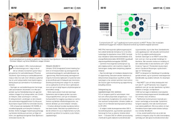 Pyro ble etablert i 1951, med produksjon av forbrenningsovner. I dag er de en del av Ulmatec-konsernet og har fokus på systemer for varmedistribusjon( Thermal Solutions). Gjenvinning av overskuddsvarmeenergi er ikke noe nytt, men Ulmatecs systemer har en unik funksjonalitet med strømningsfordeling basert på varmebehov fra forbrukssystemene. – Styringen av varmedistribusjonen har lenge vært automatisert. Nå ønsket vi en ikke-proprietær og mer fleksibelløsning som gjør det enklere å legge til ny funksjonalitet, sier Christian Håhjem, leder automasjon i Ulmatec. Et viktig element i utviklingen er den industrielle automatiseringsplattformen EcoStruxure Automation Expert( EAE) fra Schneider Electric. – EAE er basert på standarden IEC 61499, et modelleringsspråk som benytter funksjonsblokker. Dette muliggjør maskinvareuavhengig og fleksibel distribusjon på tvers av Edge-enheter, sier applikasjonsingeniør Stian Bjerkeset i Schneider Electric AS.