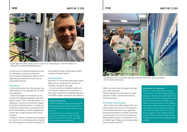 Redundans Vi finner litt ferskvare innen styring også. Julie Hallenstvedt viser oss selskapets PLS S7-1500 med redundans.- Nå kan man legge til nye moduler, for eksempel I / O( innganger / utganger) under drift, såkalt « runtime ». Det er selvsagt viktig for modifikasjoner i prosesser som ikke kan stoppes. Hos Steffen Andreassen finner vi en kjekk sak for fleksibel engineering, en kompakt I / O-modul for feltinstallasjon med 16 konfigurerbare kanaler. Den er døpt Compact Field Unit på siemensk.- Enheten er klar for installasjon og er designet for et bruk i et stort temperaturvindu. Brukeren kan fritt konfigurere hver kanal individuelt til å være analog inngang, analog utgang, digital inngang eller digital utgang.