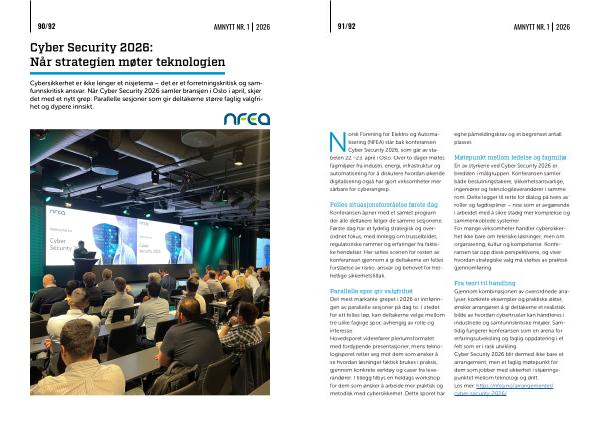 Fra teori til handling Gjennom kombinasjonen av overordnede analyser, konkrete eksempler og praktiske økter, ønsker arrangøren å gi deltakerne et realistisk bilde av hvordan cybertrusler kan håndteres i industrielle og samfunnskritiske miljøer. Samtidig fungerer konferansen som en arena for erfaringsutveksling og faglig oppdatering i et felt som er i rask utvikling. Cyber Security 2026 blir dermed ikke bare et arrangement, men et faglig møtepunkt for dem som jobber med sikkerhet i skjæringspunktet mellom teknologi og drift. Les mer: https:// nfea. no / arrangementer / cyber-security-2026 /