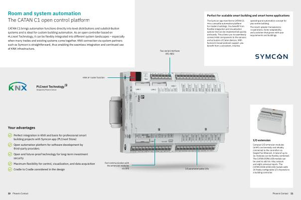 CATAN C1 brings automation functions directly into level distributions and subdistribution systems and is ideal for custom building automation. As an open controller based on PLCnext Technology, it can be flexibly integrated into different system landscapes – especially when many trades and existing systems come together. KNX connection via system partners such as Symcon is straightforward, thus enabling the seamless integration and continued use of KNX infrastructure.