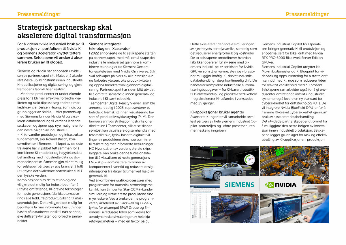 Siemens Industrial Copilot for Operations bringer generativ KI til produksjon og er optimalisert for lokal drift med Nvidia RTX PRO 6000 Blackwell Server Edition GPU-er. Siemens Industrial Copilot utnytter Ne- Mo-mikrotjenester og KI Blueprint for videosøk og oppsummering for å støtte drift i sanntid med KI, noe som reduserer tiden for reaktivt vedlikehold med 30 prosent. Selskapene samarbeider også for å gi produsenter omfattende innsikt i industrielle systemer og å levere en ny standard for cybersikkerhet for driftsteknologi( OT). De vil integrere Nvidia BlueField DPU-er for å fremme KI-drevet cybersikkerhet gjennom bruk av akselerert databehandling Det utvidede partnerskapet er utformet for å muliggjøre den neste bølgen av innovasjon innen industriell produksjon. Selskapene legger grunnlaget for rask og effektiv utrulling av KI-applikasjoner i produksjon.
