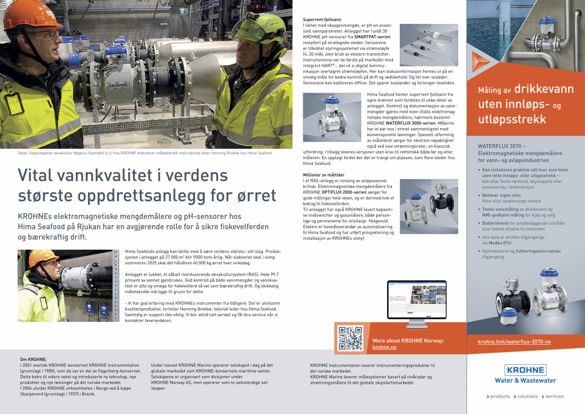 Hima Seafood henter superrent fjellvann fra egne brønner som fordeles til ulike deler av anlegget. Kontroll og dokumentasjon av vannmengder gjøres med noen titalls elektromagnetiske mengdemålere, nærmere bestemt KROHNE WATERFLUX 3000-serien. Målerne har et par ess i ermet sammenlignet med konvensjonelle løsninger. Spesiell utforming av målerøret sørger for ekstrem nøyaktighet også ved lave strømningsrater, en klassisk utfordring. I tillegg leveres versjoner uten krav til rettstrekk både før og etter måleren. En opplagt fordel der det er trangt om plassen, som flere steder hos Hima Seafood.