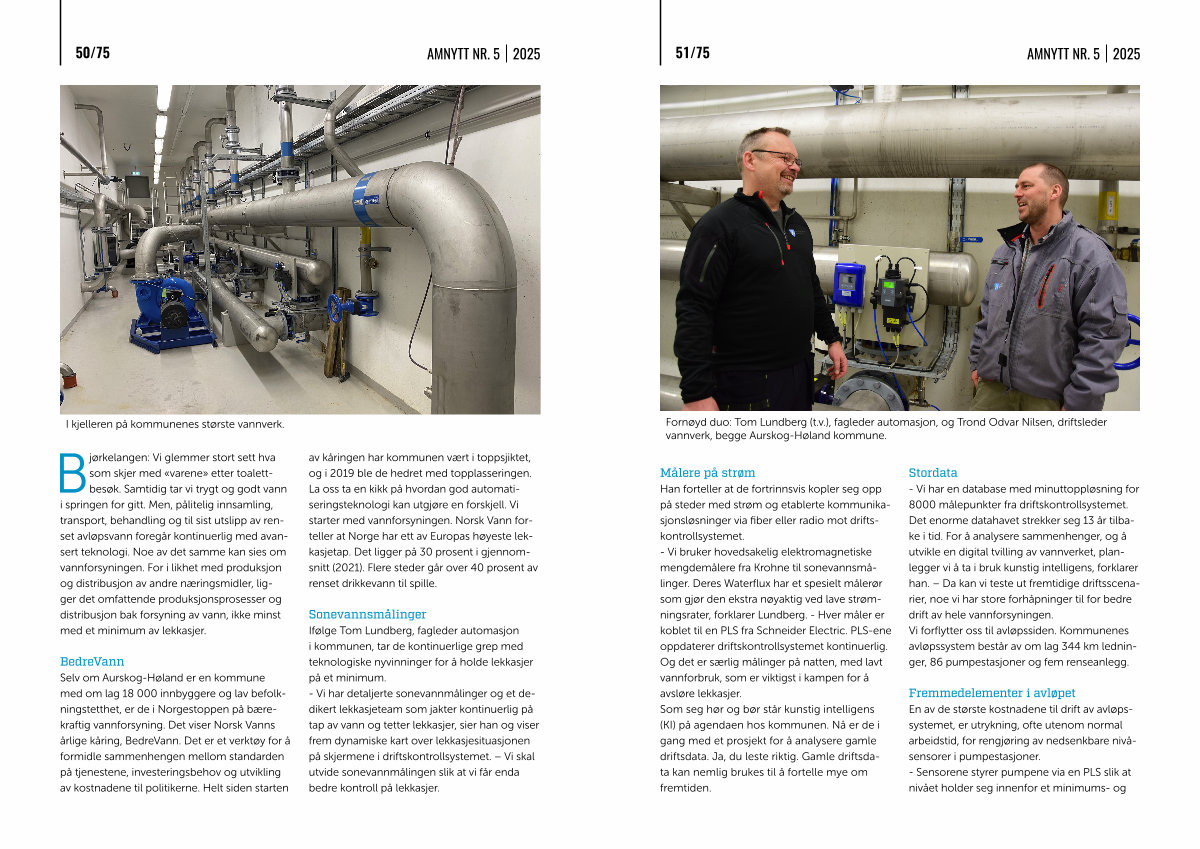 Målere på strøm Han forteller at de fortrinnsvis kopler seg opp på steder med strøm og etablerte kommunikasjonsløsninger via fiber eller radio mot driftskontrollsystemet.- Vi bruker hovedsakelig elektromagnetiske mengdemålere fra Krohne til sonevannsmålinger. Deres Waterflux har et spesielt målerør som gjør den ekstra nøyaktig ved lave strømningsrater, forklarer Lundberg.- Hver måler er koblet til en PLS fra Schneider Electric. PLS-ene oppdaterer driftskontrollsystemet kontinuerlig. Og det er særlig målinger på natten, med lavt vannforbruk, som er viktigst i kampen for å avsløre lekkasjer. Som seg hør og bør står kunstig intelligens( KI) på agendaen hos kommunen. Nå er de i gang med et prosjekt for å analysere gamle driftsdata. Ja, du leste riktig. Gamle driftsdata kan nemlig brukes til å fortelle mye om fremtiden.
