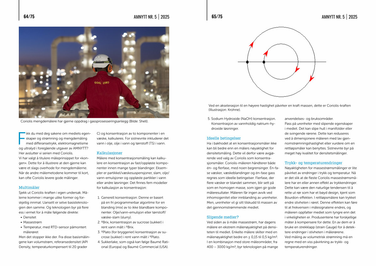 Fikk du med deg sakene om mediets egenskaper og strømning og mengdemåling med differansetrykk, elektromagnetisme og ultralyd i foregående utgaver av AMNYTT? Her avslutter vi serien med Coriolis. Vi har valgt å titulere måleprinsippet for « kongen ». Dette for å illustrere at den gjerne kan være et slags overhode for mengdemålerne. Når de andre målemetodene kommer til kort, kan ofte Coriolis levere gode målinger.