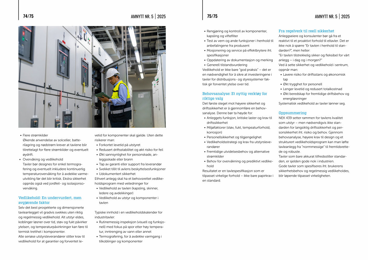 • Overvåking og vedlikehold Tavler bør designes for enkel termografering og eventuelt inkludere kontinuerlig temperaturovervåking for å avdekke varmeutvikling før det blir kritisk. Ekstra sikkerhet oppnås også ved jordfeil- og isolasjonsovervåking.
