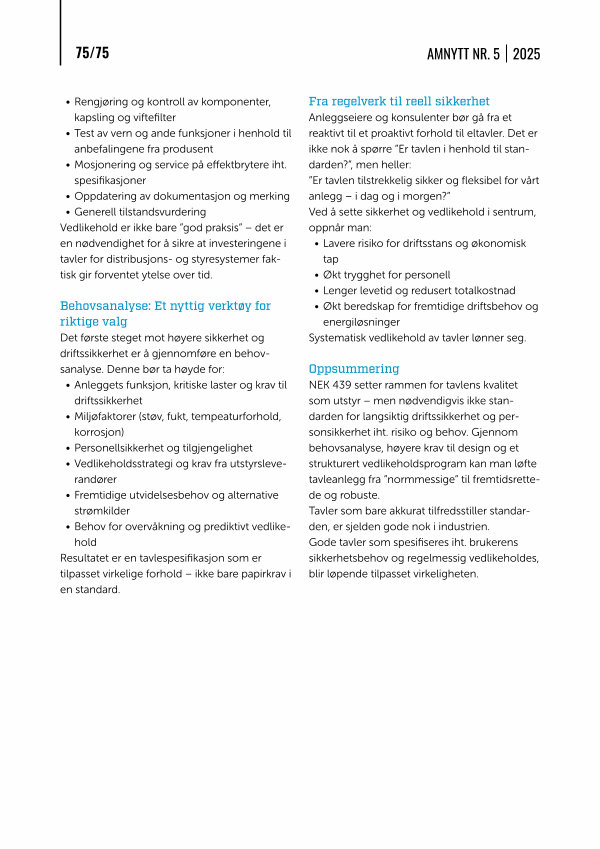 Oppsummering NEK 439 setter rammen for tavlens kvalitet som utstyr – men nødvendigvis ikke standarden for langsiktig driftssikkerhet og personsikkerhet iht. risiko og behov. Gjennom behovsanalyse, høyere krav til design og et strukturert vedlikeholdsprogram kan man løfte tavleanlegg fra” normmessige” til fremtidsrettede og robuste. Tavler som bare akkurat tilfredsstiller standarden, er sjelden gode nok i industrien. Gode tavler som spesifiseres iht. brukerens sikkerhetsbehov og regelmessig vedlikeholdes, blir løpende tilpasset virkeligheten.