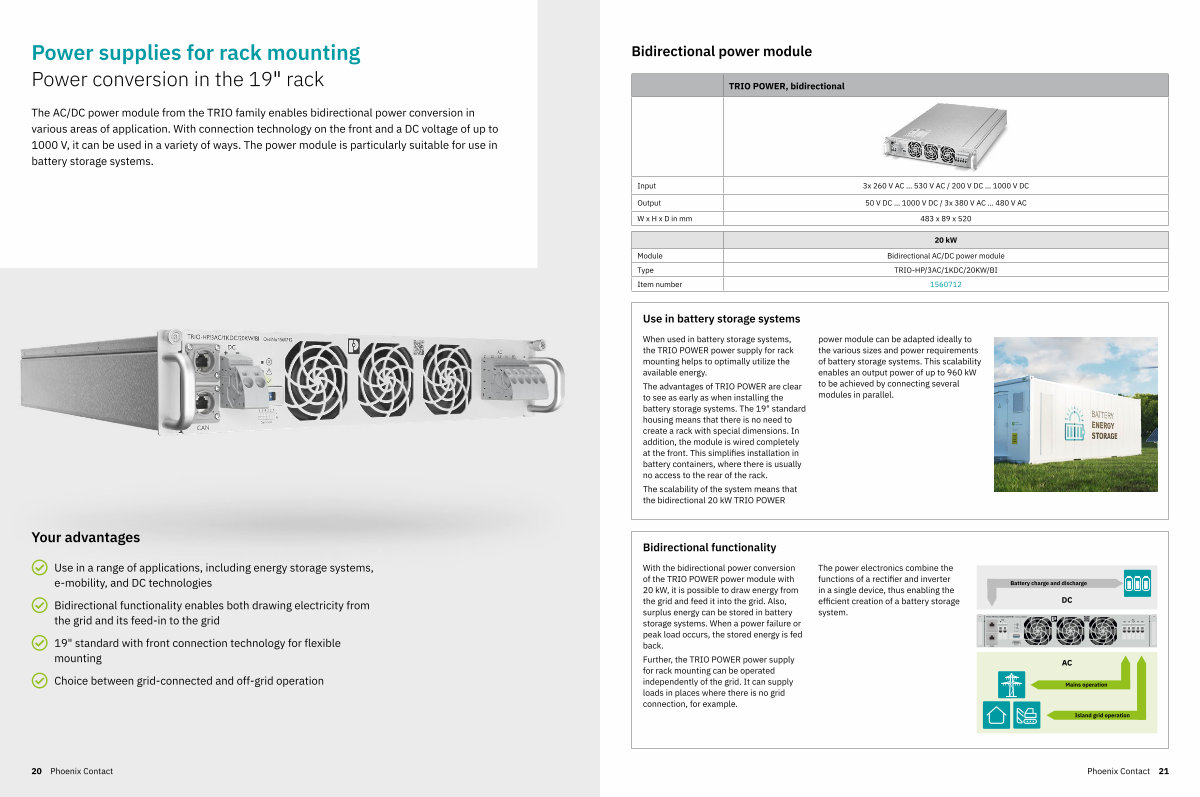 The AC / DC power module from the TRIO family enables bidirectional power conversion in various areas of application. With connection technology on the front and a DC voltage of up to 1000 V, it can be used in a variety of ways. The power module is particularly suitable for use in battery storage systems.