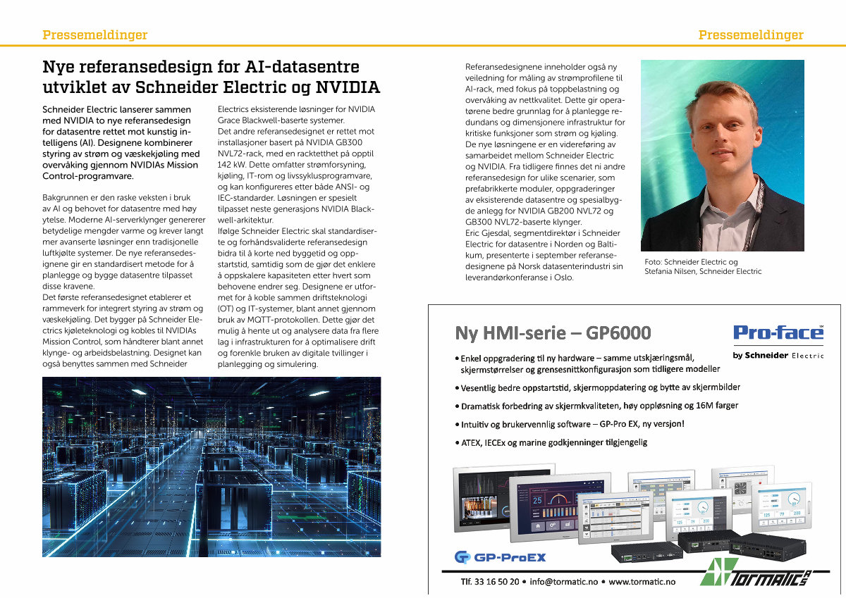 Electrics eksisterende løsninger for NVIDIA Grace Blackwell-baserte systemer. Det andre referansedesignet er rettet mot installasjoner basert på NVIDIA GB300 NVL72-rack, med en racktetthet på opptil 142 kW. Dette omfatter strømforsyning, kjøling, IT-rom og livssyklusprogramvare, og kan konfigureres etter både ANSI- og IEC-standarder. Løsningen er spesielt tilpasset neste generasjons NVIDIA Blackwell-arkitektur. Ifølge Schneider Electric skal standardiserte og forhåndsvaliderte referansedesign bidra til å korte ned byggetid og oppstartstid, samtidig som de gjør det enklere å oppskalere kapasiteten etter hvert som behovene endrer seg. Designene er utformet for å koble sammen driftsteknologi( OT) og IT-systemer, blant annet gjennom bruk av MQTT-protokollen. Dette gjør det mulig å hente ut og analysere data fra flere lag i infrastrukturen for å optimalisere drift og forenkle bruken av digitale tvillinger i planlegging og simulering.