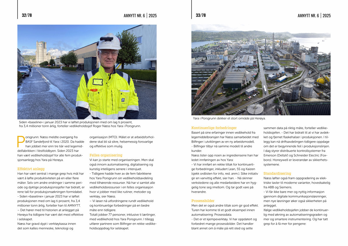 Effektivt anlegg Han har vært sentral i mange grep hvis mål har vært å løfte produktiviteten på en eller flere måter. Selv om andre endringer i samme periode og dyktige produksjonssjefer har bidratt, er rene tall for produksjonsøkningen formidabel.- Siden « baseline » i januar 2023 har vi løftet produksjonen med om lag ti prosent, fra 3,4 millioner tonn årlig, forteller han til AMNYTT. – Det hører med til historien at anlegget på Herøya fra tidligere har vært det mest effektive i selskapet. Næss har gravd dypt i verktøykassa innen det som kalles menneske, teknologi og organisasjon( MTO). Målet er at arbeidsforholdene skal bli så sikre, helsemessig forsvarlige og effektive som mulig.