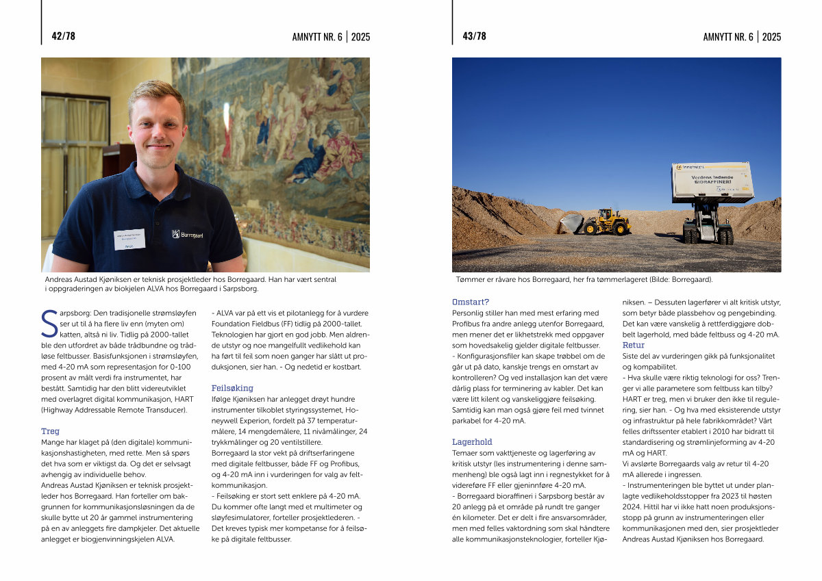 Lagerhold Temaer som vakttjeneste og lagerføring av kritisk utstyr( les instrumentering i denne sammenheng) ble også lagt inn i regnestykket for å videreføre FF eller gjeninnføre 4-20 mA.- Borregaard bioraffineri i Sarpsborg består av 20 anlegg på et område på rundt tre ganger én kilometer. Det er delt i fire ansvarsområder, men med felles vaktordning som skal håndtere alle kommunikasjonsteknologier, forteller Kjøniksen. – Dessuten lagerfører vi alt kritisk utstyr, som betyr både plassbehov og pengebinding. Det kan være vanskelig å rettferdiggjøre dobbelt lagerhold, med både feltbuss og 4-20 mA. Retur Siste del av vurderingen gikk på funksjonalitet og kompabilitet.- Hva skulle være riktig teknologi for oss? Trenger vi alle parametere som feltbuss kan tilby? HART er treg, men vi bruker den ikke til regulering, sier han.- Og hva med eksisterende utstyr og infrastruktur på hele fabrikkområdet? Vårt felles driftssenter etablert i 2010 har bidratt til standardisering og strømlinjeforming av 4-20 mA og HART. Vi avslørte Borregaards valg av retur til 4-20 mA allerede i ingressen.- Instrumenteringen ble byttet ut under planlagte vedlikeholdsstopper fra 2023 til høsten 2024. Hittil har vi ikke hatt noen produksjonsstopp på grunn av instrumenteringen eller kommunikasjonen med den, sier prosjektleder Andreas Austad Kjøniksen hos Borregaard.