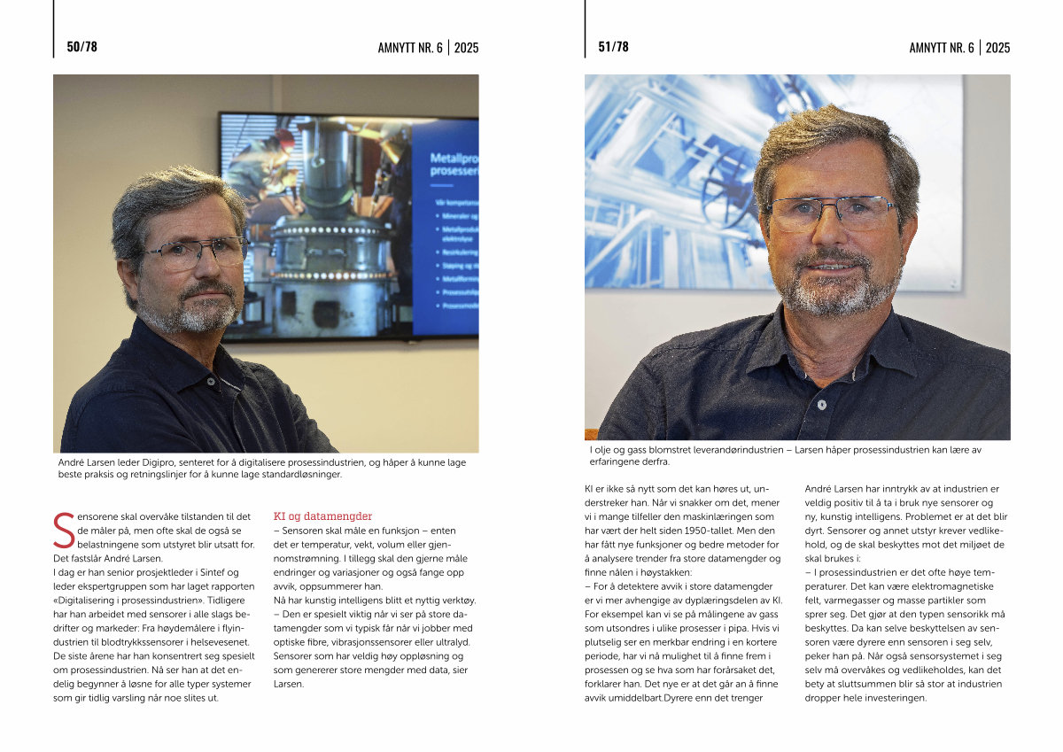 Sensorene skal overvåke tilstanden til det de måler på, men ofte skal de også se belastningene som utstyret blir utsatt for. Det fastslår André Larsen. I dag er han senior prosjektleder i Sintef og leder ekspertgruppen som har laget rapporten « Digitalisering i prosessindustrien ». Tidligere har han arbeidet med sensorer i alle slags bedrifter og markeder: Fra høydemålere i flyindustrien til blodtrykkssensorer i helsevesenet. De siste årene har han konsentrert seg spesielt om prosessindustrien. Nå ser han at det endelig begynner å løsne for alle typer systemer som gir tidlig varsling når noe slites ut.