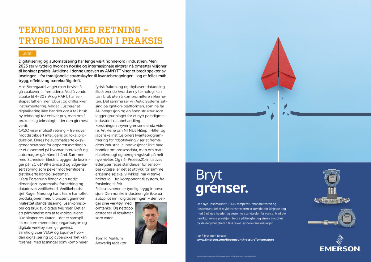 Hos Borregaard velger man bevisst å gå « bakover til fremtiden ». Ved å vende tilbake til 4 – 20 mA og HART, har selskapet fått en mer robust og driftssikker instrumentering. Valget illustrerer at digitalisering ikke handler om å ta i bruk ny teknologi for enhver pris, men om å bruke riktig teknologi – der den gir mest verdi. OXZO viser motsatt retning – fremover mot distribuert intelligens og lokal produksjon. Deres helautomatiserte oksygengeneratorer for oppdrettsnæringen er et eksempel på hvordan bærekraft og automasjon går hånd i hånd. Sammen med Schneider Electric bygger de løsninger på IEC 61499-standard og Edge-basert styring som peker mot fremtidens distribuerte kontrollsystemer. I Yara Porsgrunn finner vi en tredje dimensjon: systematisk forbedring og datadrevet vedlikehold. Vedlikeholdssjef Roger Næss og hans team har løftet produksjonen med ti prosent gjennom målrettet standardisering, Lean-prinsipper og bruk av digitale tvillinger. Det er en påminnelse om at teknologi alene ikke skaper resultater – det er samspillet mellom mennesker, organisasjon og digitale verktøy som gir gevinst. Samtidig viser VEGA og Equinor hvordan digitalisering og cybersikkerhet kan forenes. Med løsninger som kombinerer fysisk frakobling og skybasert datadeling, illustrerer de hvordan ny teknologi kan tas i bruk uten å kompromittere sikkerheten. Det samme ser vi i Autic Systems satsing på Ignition-plattformen, som nå får AI-integrasjon og en åpen struktur som legger grunnlaget for et nytt paradigme i industriell databehandling. Forskningen skyver grensene enda videre. Artiklene om NTNUs HiSep II-filter og japanske institusjoners kvanteprogrammering for robotstyring viser at fremtidens industrielle innovasjoner ikke bare handler om prosessdata, men om materialteknologi og beregningskraft på helt nye nivåer. Og når Prosess21-initiativet etterlyser felles standarder for sensorbeskyttelse, er det et uttrykk for samme erkjennelse: skal vi lykkes, må vi tenke helhetlig – fra komponent til system, fra forskning til felt. Fellesnevneren er tydelig: trygg innovasjon. Den norske industrien går ikke på autopilot inn i digitaliseringen – den velger sine verktøy med omtanke. Og nettopp derfor ser vi resultater som varer.