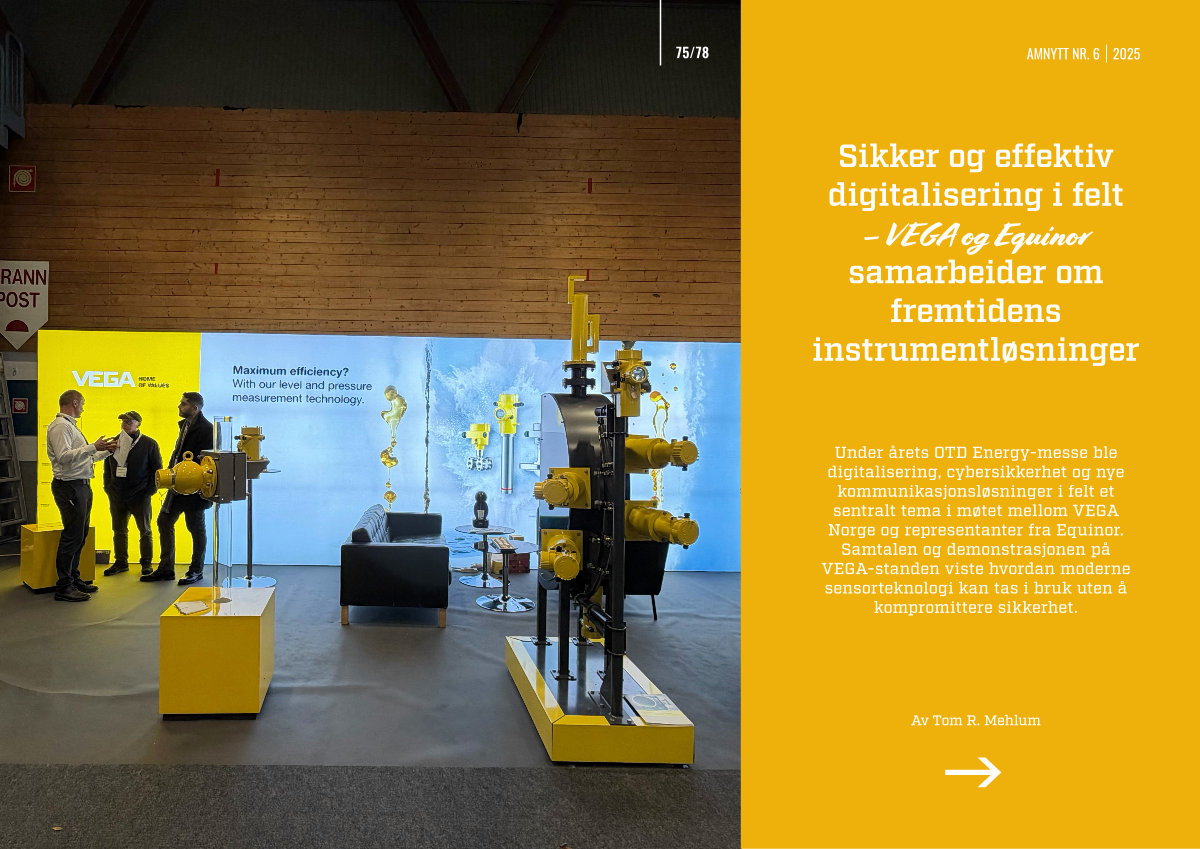 Under årets OTD Energy-messe ble digitalisering, cybersikkerhet og nye kommunikasjonsløsninger i felt et sentralt tema i møtet mellom VEGA Norge og representanter fra Equinor. Samtalen og demonstrasjonen på VEGA-standen viste hvordan moderne sensorteknologi kan tas i bruk uten å kompromittere sikkerhet.