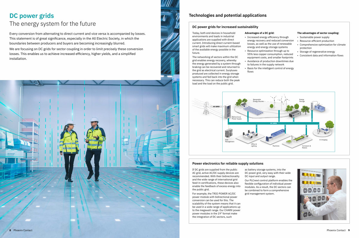 Every conversion from alternating to direct current and vice versa is accompanied by losses. This statement is of great significance, especially in the All Electric Society, in which the boundaries between producers and buyers are becoming increasingly blurred. We are focusing on DC grids for sector coupling in order to limit precisely these conversion losses. This enables us to achieve increased efficiency, higher yields, and a simplified installation.