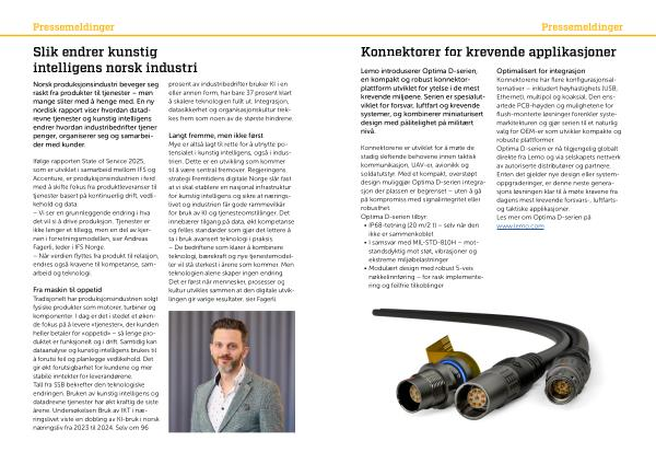 Ifølge rapporten State of Service 2025, som er utviklet i samarbeid mellom IFS og Accenture, er produksjonsindustrien i ferd med å skifte fokus fra produktleveranser til tjenester basert på kontinuerlig drift, vedlikehold og data. – Vi ser en grunnleggende endring i hva det vil si å drive produksjon. Tjenester er ikke lenger et tillegg, men en del av kjernen i forretningsmodellen, sier Andreas Fagerli, leder i IFS Norge. – Når verdien flyttes fra produkt til relasjon, endres også kravene til kompetanse, samarbeid og teknologi.