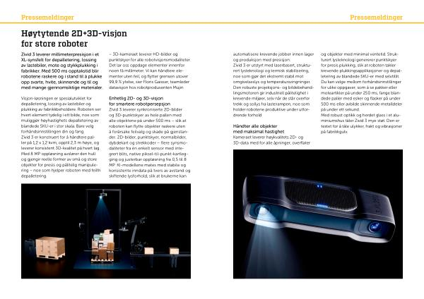 Enhetlig 2D- og 3D-visjon for smartere robotpersepsjon Zivid 3 leverer synkroniserte 2D-bilder og 3D-punktskyer av hele pallen med alle objektene på under 500 ms – slik at roboten kan flytte objekter raskere uten å forårsake feilvalg og skade på gjenstander. 2D-bilder, punktskyer, normalbilder, dybdekart og strekkoder – flere synsmodaliteter fra én enkelt sensor med integrert blits, native piksel-til-punkt-kartlegging og justerbar oppløsning fra 0,5 til 8 MP. KI-modellene mates med stabile og konsistente inndata på tvers av avstand og skiftende lysforhold, slik at brukerne kan