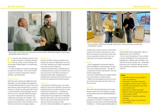 Kjapp respons VEGA har vært i Norge siden 1988, først med distributør. I år feirer selskapet 10-årsjubileum med eget datterselskap her i landet. Selv om de gule boksene, altså instrumentene, er viktig for suksessen i Norge, har andre grep stått sentralt.- Gode produkter må selvsagt ligge i bunnen. Men, hos oss er også høy teknisk kompetanse og korte responstider for leveranser og support alfa og omega, sier Stenkjær.- Hos oss kan alle medarbeidere svare på tekniske spørsmål når kunden ringer. De fleste som tar kontakt, har behov for en kjapp avklaring.
