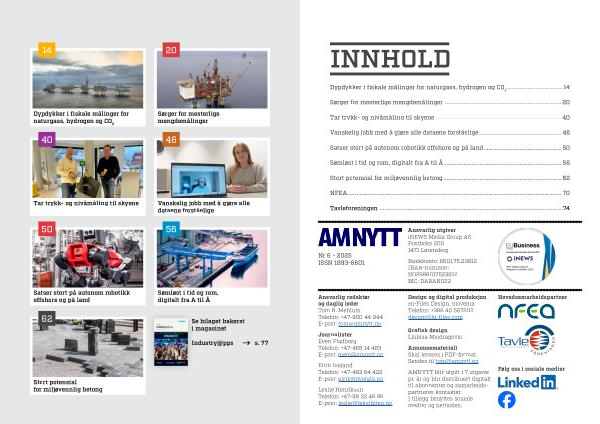 ..................................... 14 Sørger for mesterlige mengdemålinger............................................................................ 20 Tar trykk- og nivåmåling til skyene.................................................................................. 40 Vanskelig jobb med å gjøre alle dataene forståelige...................................................... 46 Satser stort på autonom robotikk offshore og på land................................................... 50 Sømløst i tid og rom, digitalt fra A til Å............................................................................ 56 Stort potensial for miljøvennlig betong............................................................................. 62 NFEA.......................................................................................................................................... 70 Tavleforeningen....................................................................................................................... 74