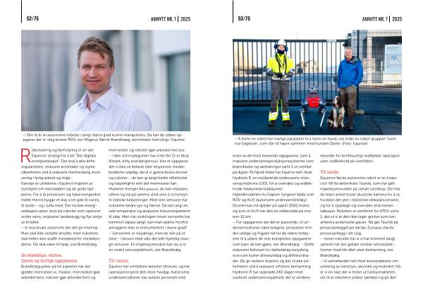 Til lands Equinors første autonome robot er en Inspector V8 fra østerrikske Taurob, som har gått inspeksjonsrunder på Johan Sverdrup. Der har de blant annet testet akustiske kamera for å se hvordan det yter i realistiske lekkasjescenarier, og for å oppdage og overvåke små metanlekkasjer. Roboten er sertifisert for ATEX-sone 1, det vil si at den ikke lager gnister som kan antenne potensielle gasser. Nå går Taurob på prosessanlegget på Kårstø, Europas største prosessanlegg i sitt slag. – Innen robotikk har vi vi har kommet langt, spesielt når det gjelder mobile sensorplattformer med lite eller uten bemanning, sier Brandtzæg. – Vi samarbeider tett med leverandørene om utvikling av robotsyn, akustikk og mobilitet. Nå er vi en fase der vi tester ut funksjonaliteten, ser til at robotene jobber sømløst og gir den