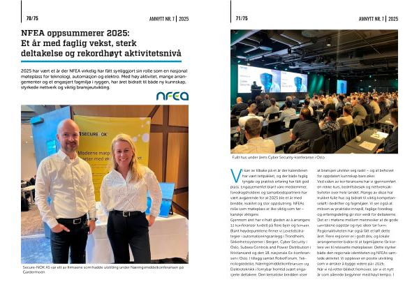Vi kan se tilbake på et år der kalenderen har vært tettpakket, og der både faglig tyngde og praktisk erfaring har fått god plass. Engasjementet blant våre medlemmer, foredragsholdere og samarbeidspartnere har vært avgjørende for at 2025 ble et år med bredde, kvalitet og stor oppslutning. NFEAs rolle som møteplass er like viktig som før – kanskje viktigere. Gjennom året har vi hatt gleden av å arrangere 13 konferanser fordelt på flere byer og temaer. Blant høydepunktene finner vi Levetidsstrategier i automatiseringsanlegg i Trondheim, Sikkerhetssystemer i Bergen, Cyber Security i Oslo, Subsea Controls and Power Distribution i Kristiansand og den 18. nasjonale Ex-konferansen i Oslo. I tillegg samlet RobotForum, Teknologiledelse, Næringsmiddelkonferansen og Elektroteknikk i fornybar fremtid svært engasjerte deltakere. Den tematiske bredden viser at bransjen utvikler seg raskt – og at behovet for oppdatert kunnskap bare øker. Ved siden av konferansene har vi gjennomført en rekke kurs, bedriftsbesøk og nettverksaktiviteter over hele landet. Mange av disse har trukket fulle hus og bidratt til viktig kompetanseløft i bedrifter og fagmiljøer. Vi ser også at miksen av praktiske innspill, faglige foredrag og erfaringsdeling gir stor verdi for deltakerne. Det er i møtene mellom mennesker at de gode samtalene oppstår og nye ideer tar form. Regionaktiviteten har også fått et løft dette året. Flere regioner er i godt driv, og lokale arrangementer bidrar til at fagmiljøene får kortere vei til relevante møteplasser. Dette styrker både den regionale identiteten og NFEAs samlede aktivitet. Vi opplever en positiv utvikling som vi ønsker å bygge videre på i 2026. Når vi nå retter blikket fremover, ser vi et nytt år som allerede begynner med høyt tempo. I